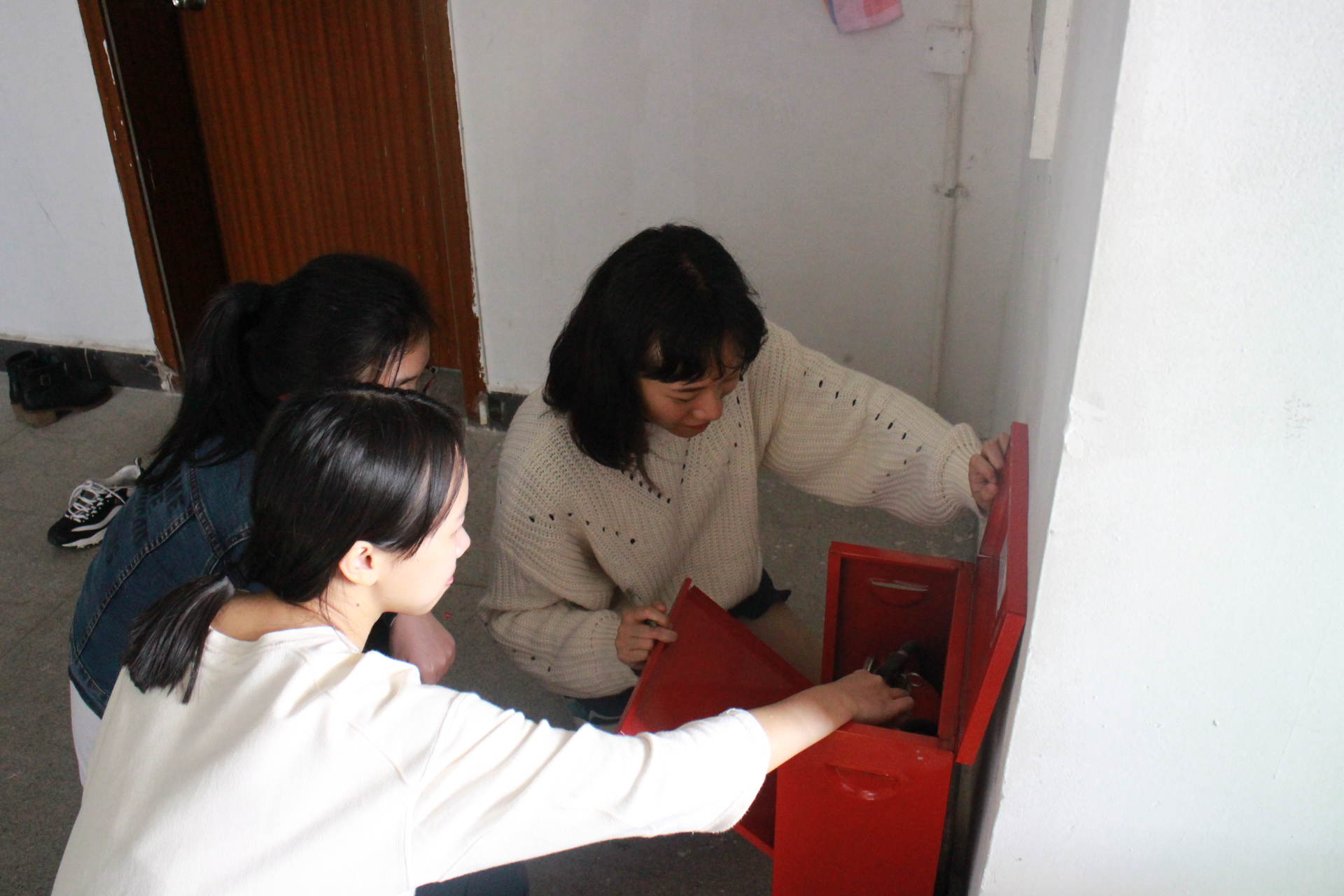 楼委会成员组织检查消防器材