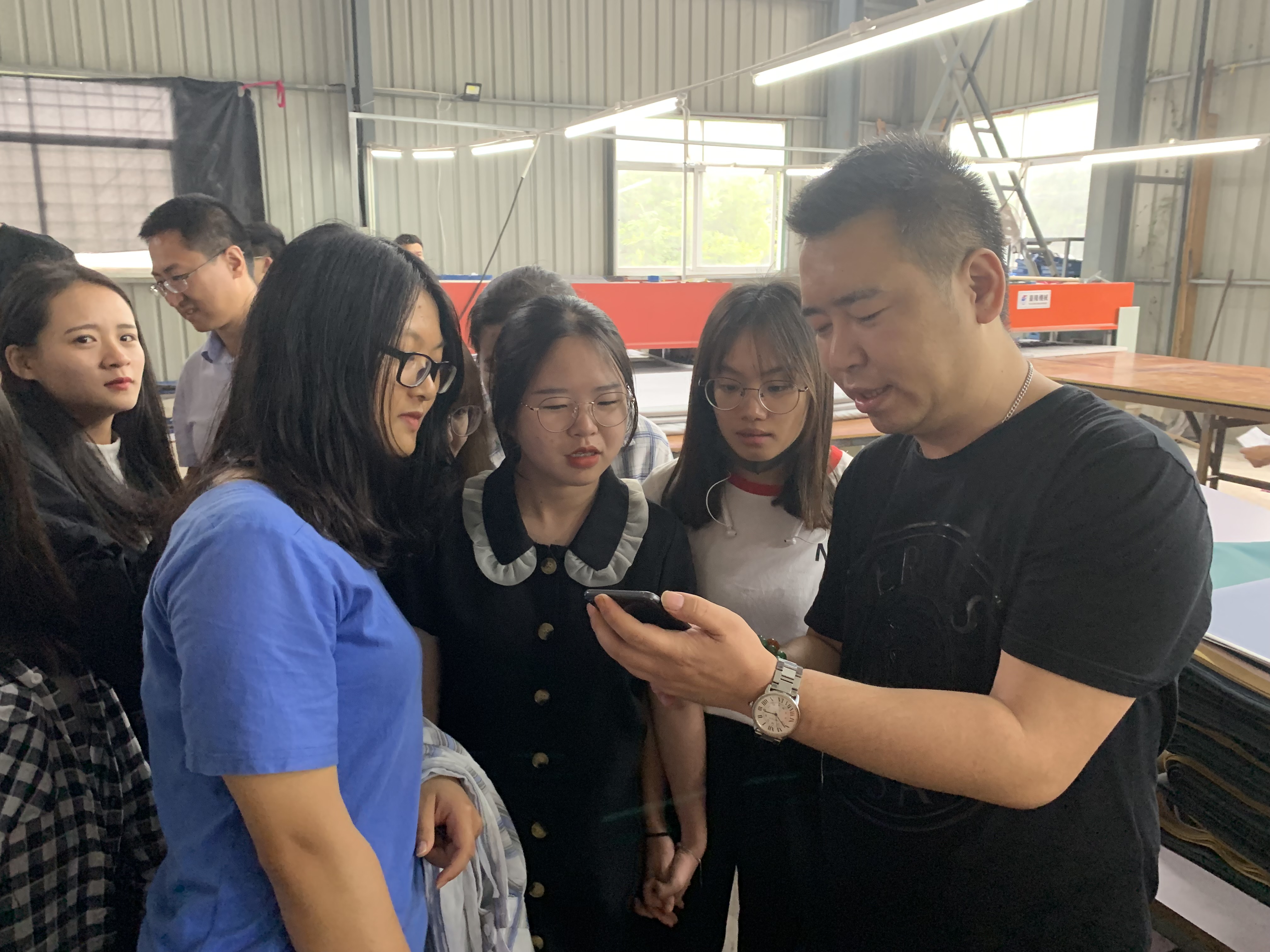 参观学习前,同学们认真了解杜可箱包公司的相关简介,指导老师李曦还以杜可公司具体的经济业务为例,让同学们思考如何做账的问题。带着问题,同学们在杜可公司董事长杜增堤先生的带领下走访了生产车间和仓库,参观了近20条生产线和1个柔性智能设计工作室的工人们的机器操作过程。杜增堤先生耐心地为同学们讲解公司的生产流程和产品特色,鼓励同学们好好珍惜在大学的学习机会,以后用自己的所学实现人生理想,同学们备受鼓舞,气氛活跃。