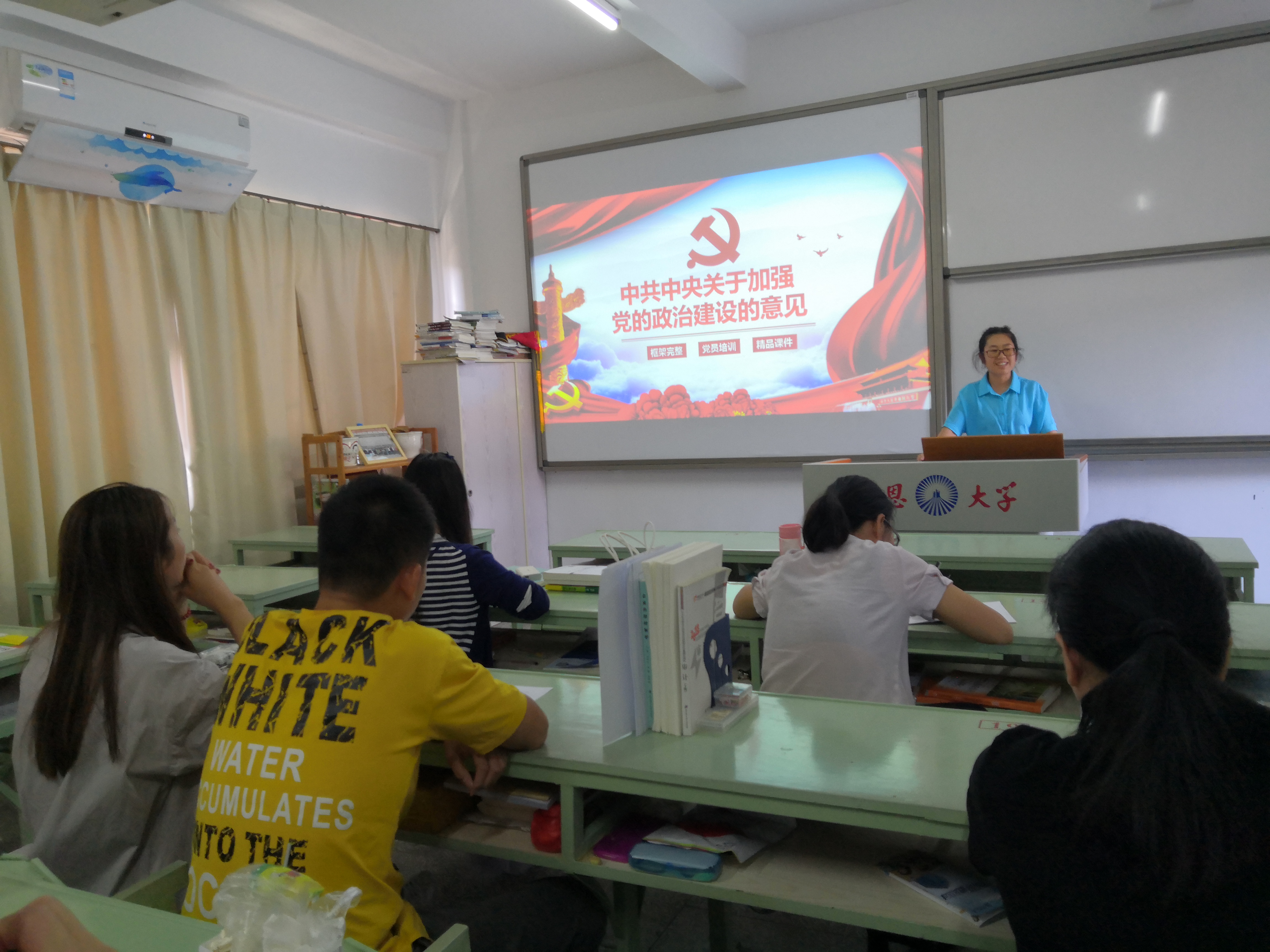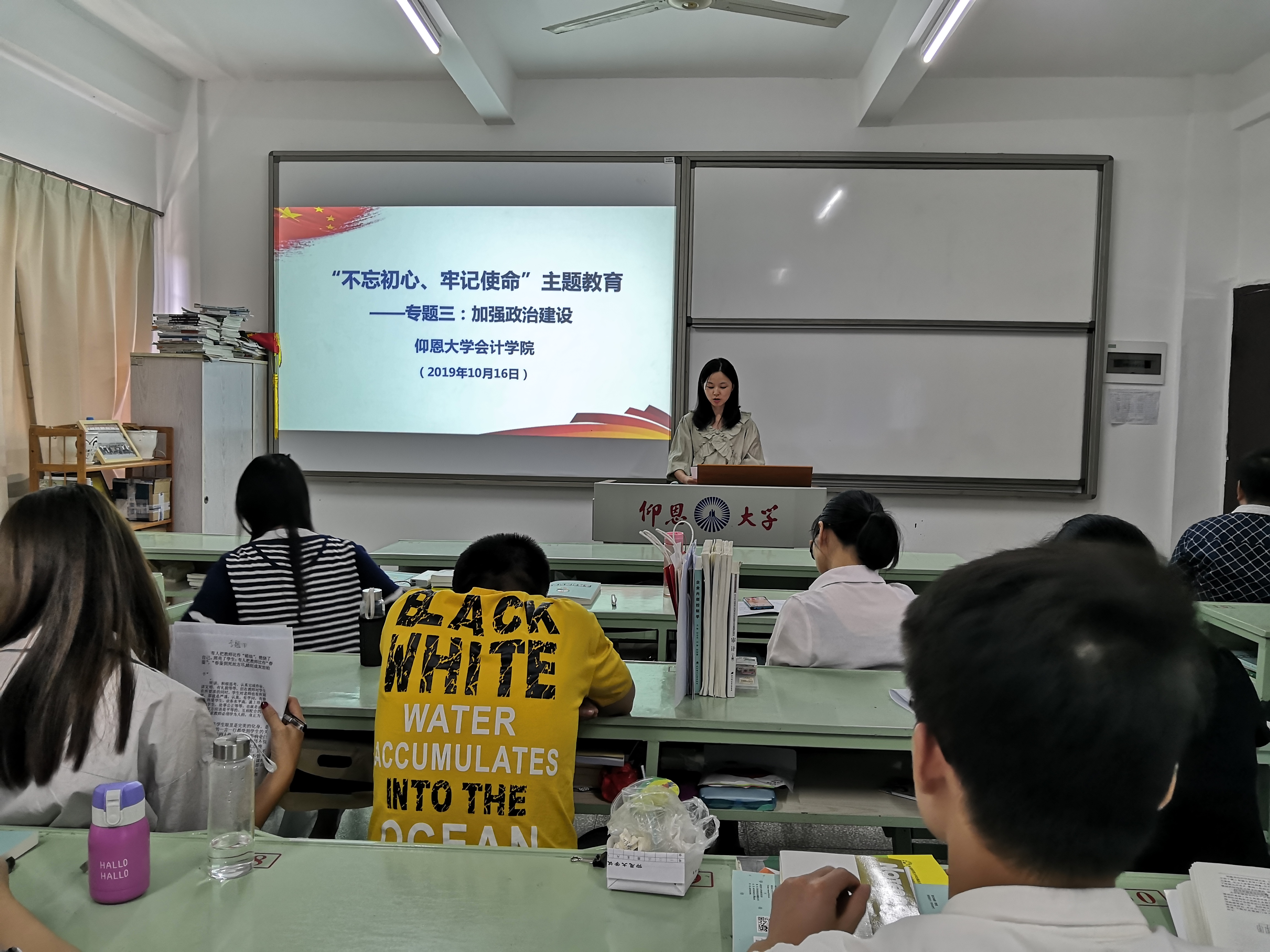 2019年10月16日下午2:30,公司党总支在吉龙楼108教室召开“不忘初心、牢记使命”主题教育专题三“加强党的政治建设”学习研讨会,学院全体教师党员、员工党员代表参加会议。