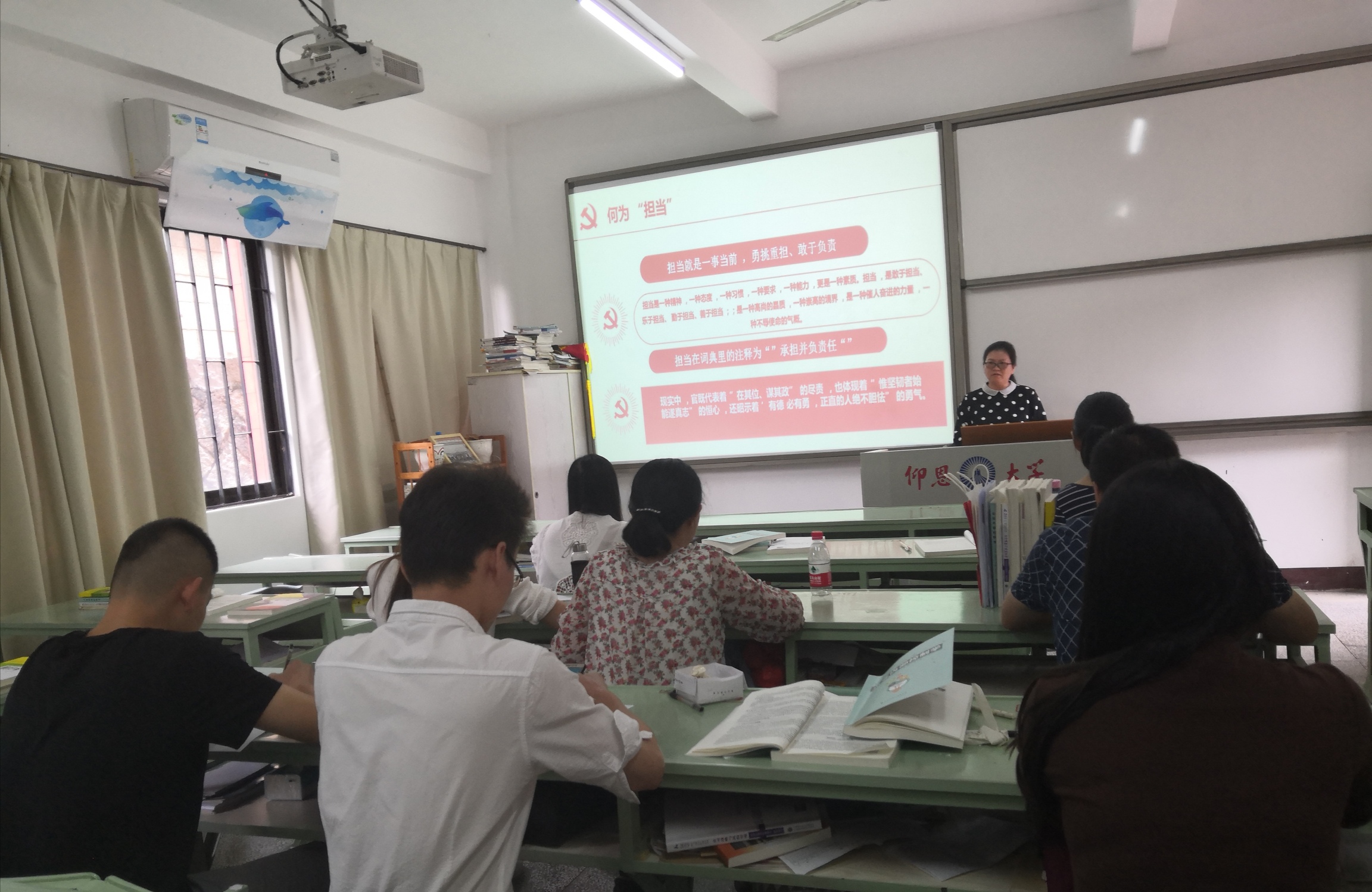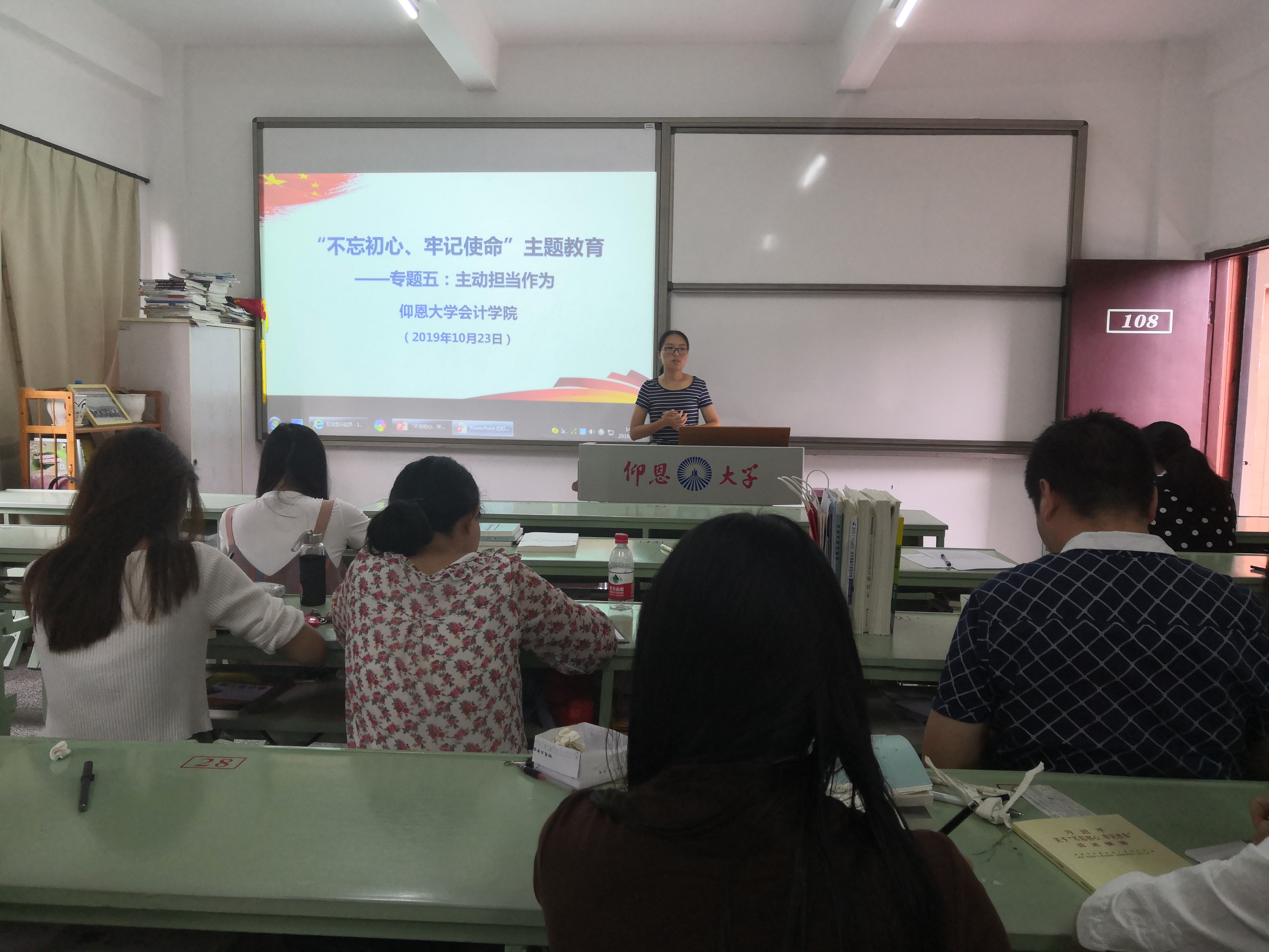 2019年10月23日下午2:30,公司党总支在吉龙楼106教室召开“不忘初心、牢记使命”主题教育专题五“主动担当作为”学习研讨会,学院全体教师党员、员工党员代表参加会议。