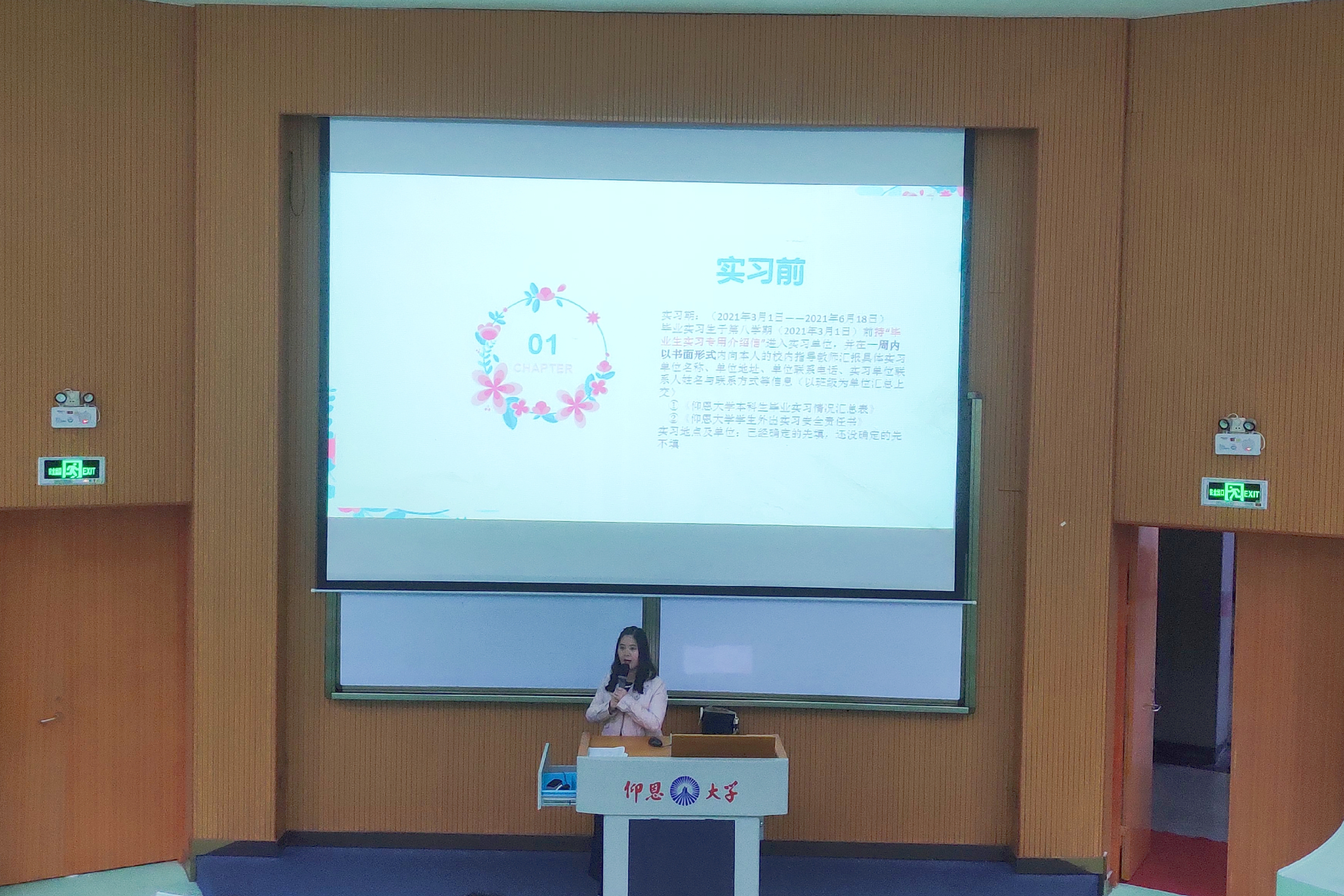 会议伊始,辅导员吴锦霞首先代表学院向2021届毕业生即将步入实习征程表示热烈祝贺。随后,任敏对实习前的具体工作进行安排,明确其目的和要求,对员工的实习内容的各个环节等注意事项做详细说明,希望员工能通过此次实习得到专业提升并锻炼自身的综合素质,找到心仪的工作。