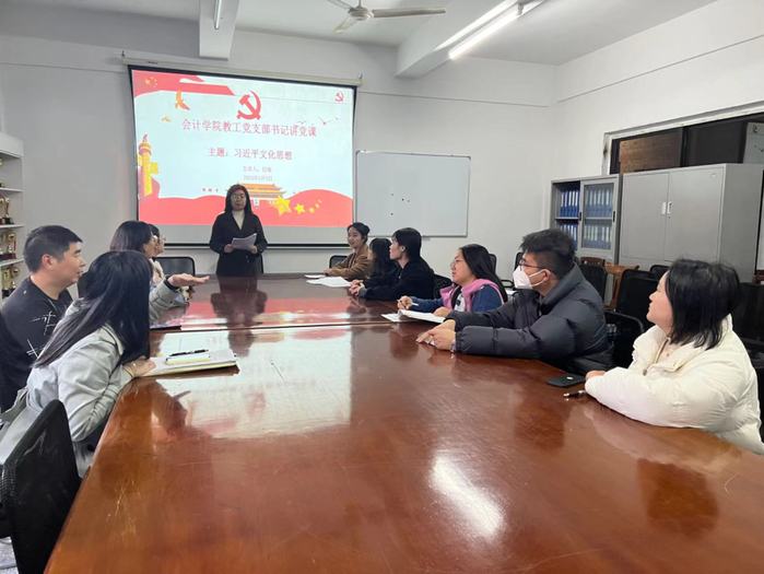为深入学习贯彻习近平文化思想,加强党的意识形态建设,1月3日下午,BV伟德官方网站教工党支部书记任敏围绕“习近平文化思想”主题,在曼谷楼306为教工支部党员讲党课。